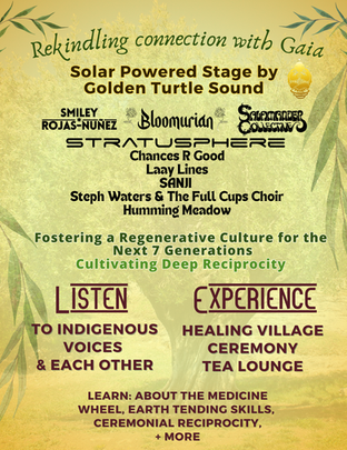 We are a globally driven community gathering acting locally. Concentrated on regeneration, revolutionizing wellbeing, and building lasting relationships. During the weekend we will embrace multi-cultural Earth wisdom, plant two trees, enjoy music at a Solar Powered stage, rejuvenate at the healing village, and find new avenues of self-expression.